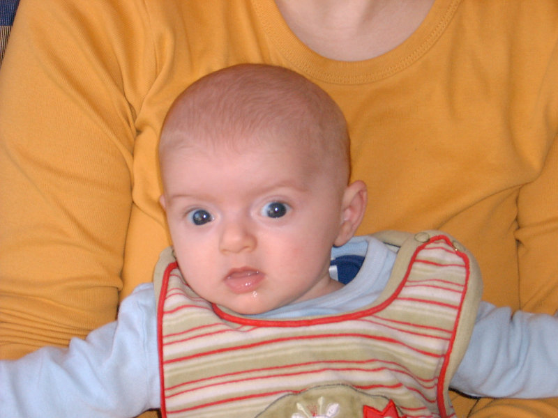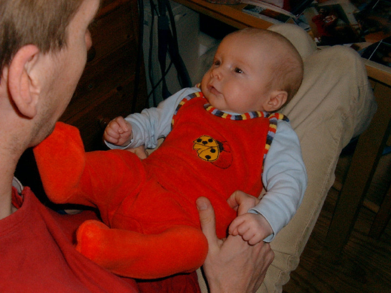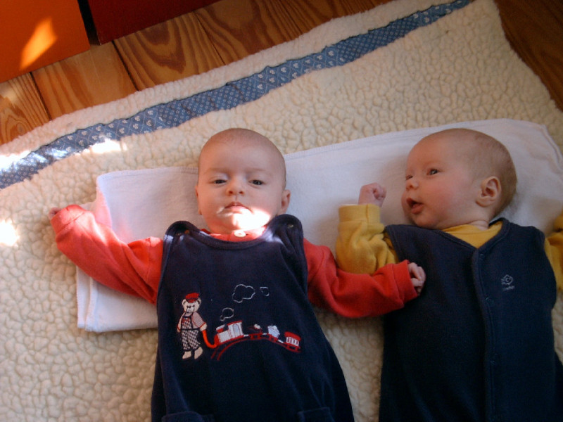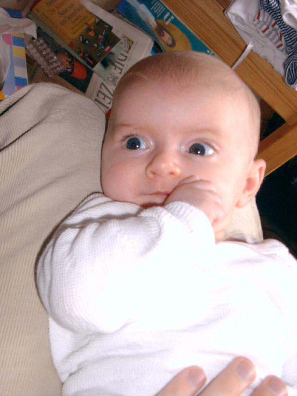 Mittlerweile interagieren wir schon richtig professionell mit unserer Umgebung. Wir unterhalten uns mit unseren Eltern, nehmen bevorzugt unsere Hände in den Mund oder stecken sie uns gegenseitig in den Mund. Weiter gibt es gerade nichts spannenderes als durch die Wohnung getragen zu werden, wir entdecken immer wieder neue Reflektionen, hell-dunkel-Kontraste oder andere Sachen, die wir uns erstmal aus sicherer Entfernung von Katrins oder Sunkes Arm betrachten. Wir sind übrigens nicht mehr die jüngsten in der Familie - wir haben, nachdem wir schon eine große Cousine Lya haben, jetzt auch noch eine kleine Cousine Frida bekommen und freuen uns schon auf gemeinsame Streiche, die wir unseren Onkels, Tanten und Eltern spielen können.
